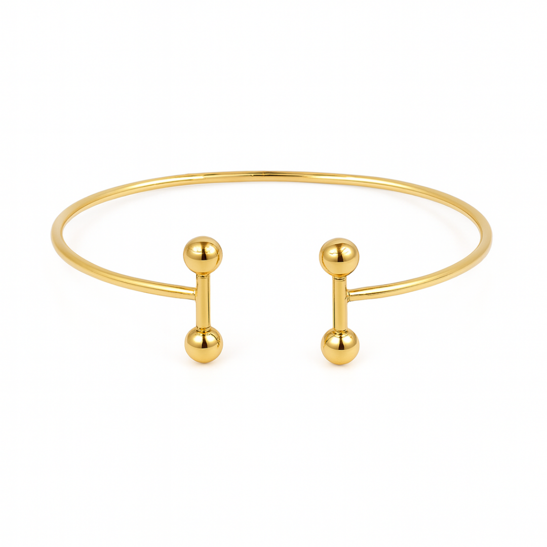 Modern sadelik ve zarif ışıltı bir arada! Çift Top Uçlu Altın Kelepçe Bileklik, minimal tasarımıyla hem günlük hem özel kombinlerin tamamlayıcısı. Altın rengin sıcak tonlarıyla her bilekte şık bir dokunuş bırakır.