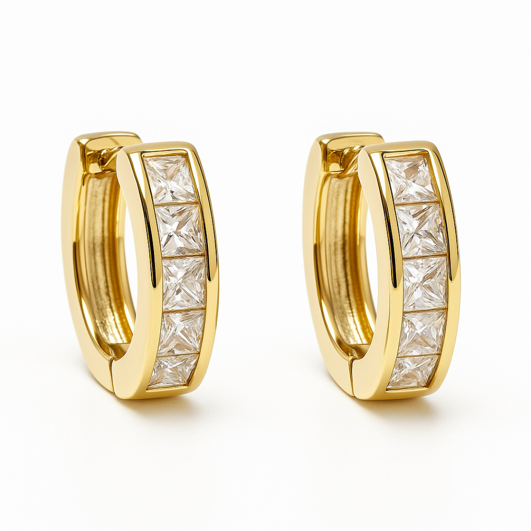 Minimalist ama etkileyici bir duruş Köşeli Taşlı Altın Halka Küpe, pürüzsüz altın yüzeyi ve dikkat çekici kare kesim taşlarıyla hem sade hem de göz alıcı bir stil sunar. Gündüzden geceye her kombinde zarif bir ışıltı yaratır.