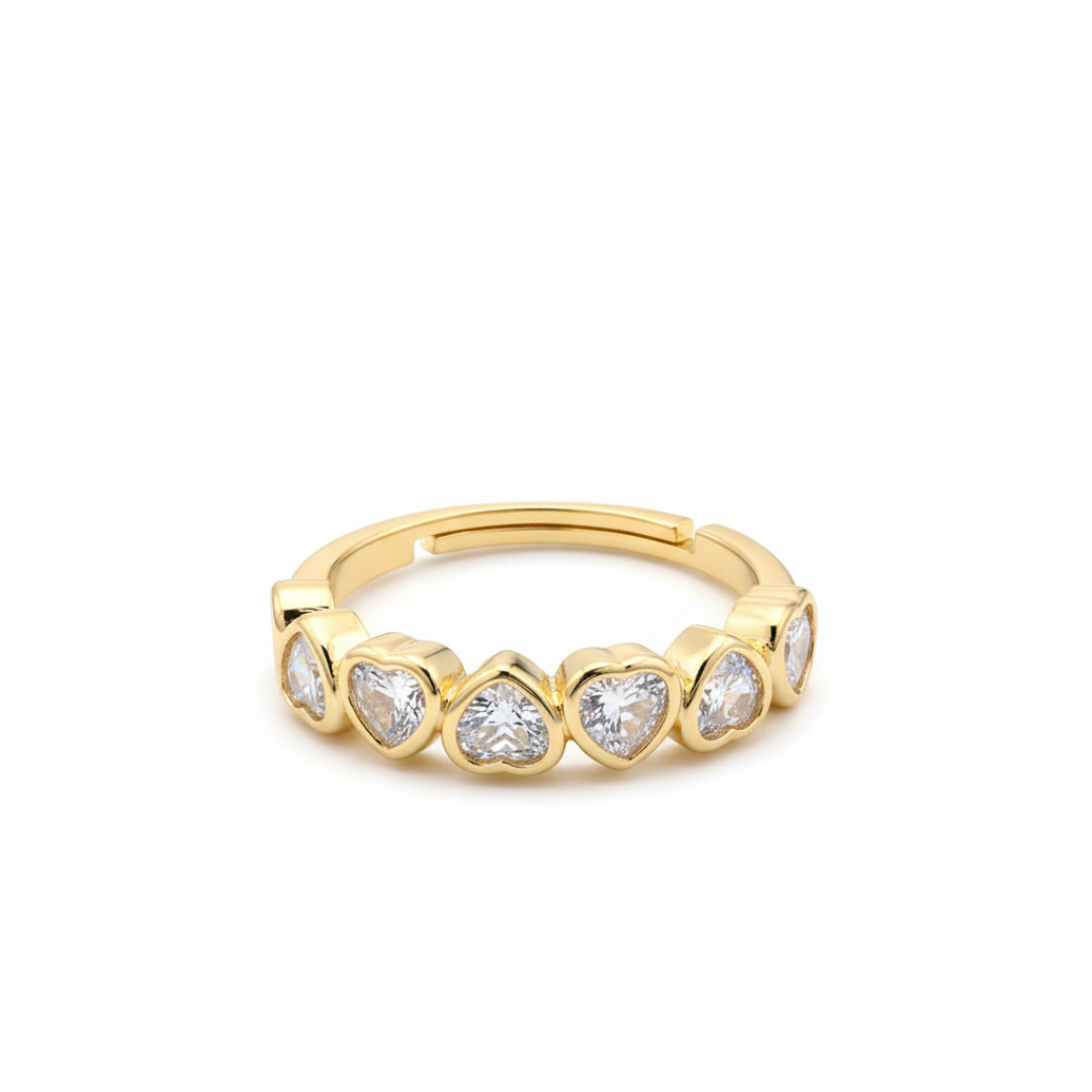 Pirinç Kaplama Sıra Taşlı Kalpli Yüzük Romantik detaylarıyla dikkat çeken bu kalpli yüzük, yan yana dizilmiş parlak taşlarıyla göz kamaştırıcı bir şıklık sunuyor. Altın tonundaki zarif kaplama ve kalp formundaki taşlar, sevgi ve zarafeti bir arada yansıtıyor. Günlük şıklıkta olduğu kadar özel günlerde de zarif bir tamamlayıcıdır.