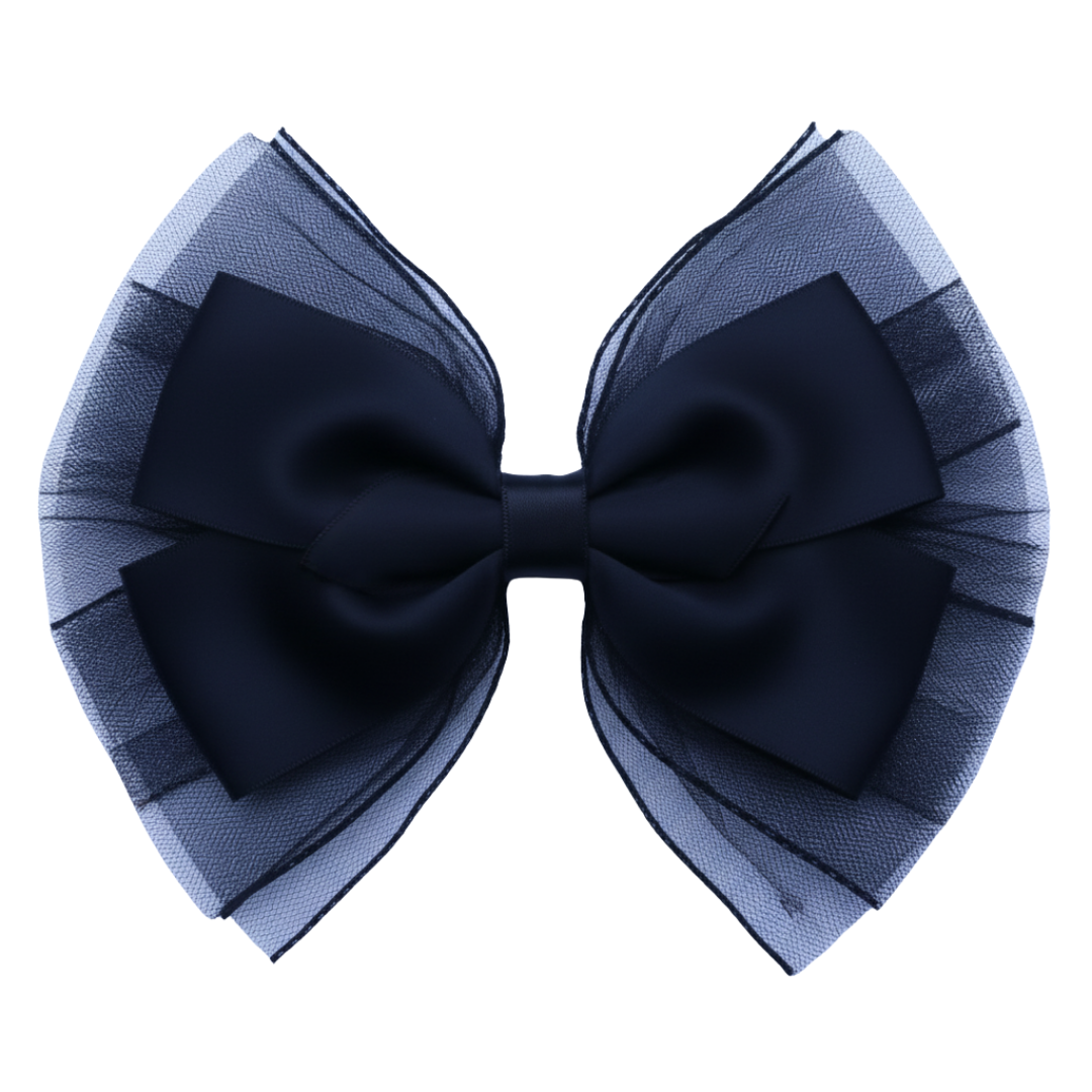 Klasik lacivertin zarafetini modern bir dokuyla buluşturan Tül Lacivert Katmanlı Fiyonk Toka, hacimli duruşu ve akıcı tül katmanlarıyla göz alıcı bir görünüm sunuyor. Yumuşak kumaş dokusu sayesinde hem konforlu hem de şık bir kullanım sağlar.