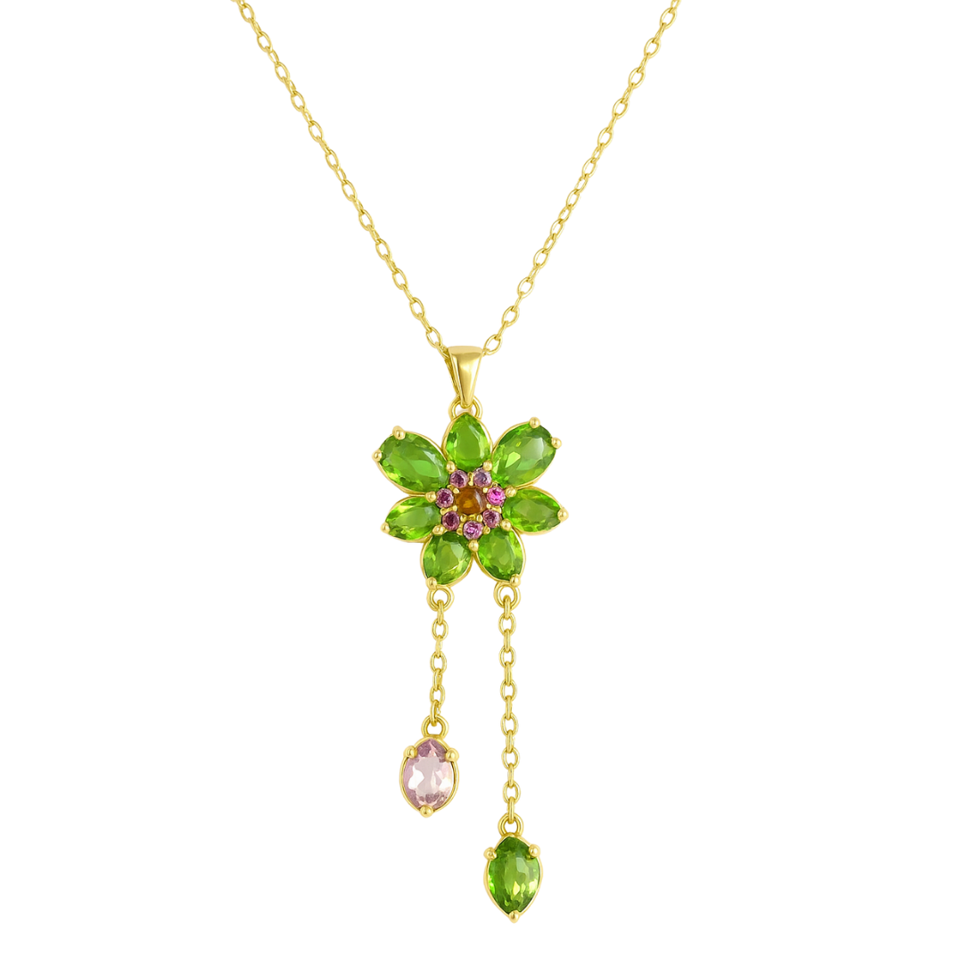 Doğadan ilham alan zarif ışıltı Yeşil Taşlı Çiçek Kolye, canlı zümrüt tonlarındaki taşları ve altın kaplama detaylarıyla boynuna taze ve enerjik bir hava katar. Ortadaki pembe taş kombinasyonu, romantik ve feminen bir dokunuş oluşturur.